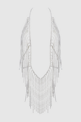 Elevate every moment with the Gemma Rhinestone Plunge and Fringe Teddy, a bold piece of lingerie jewelry crafted to captivate and inspire confidence. This stunning body drape bodysuit showcases flowing rhinestone strands that gracefully highlight your silhouette like liquid light, enveloping your curves in radiant sparkle. Featuring a halter neckline and delicate fringe accents, it offers an open bust and minimal coverage. Perfect for memorable nights, elegant events, or high-fashion boudoir photography.