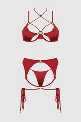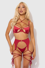 Wrap yourself in seduction with the Iryna Silky Lingerie Set, a provocative red lingerie ensemble that commands attention. Crafted from smooth satin with a gentle shimmer, this three-piece set features an open cup underwire bra, a high-waisted garter belt, and a strappy thong, all accentuated by elegant rope details that artfully drape and tie around the thighs. Gold-tone o-rings and charm accents add a luxurious touch, while the adjustable straps and structured garter belt sculpt the waistline and hips for a flattering, secure fit.