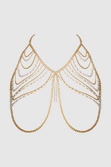 Dare to dazzle in this unapologetically seductive piece that redefines lingerie as jewelry. Crafted with glistening gold-tone chains and cascading rows of lustrous faux pearls, this bold harness-style bralette is designed to elevate your sensuality into an art form. The open cup silhouette features strategically placed strands that frame the bust beautifully. Adjustable at the back for a comfortable fit, this gold chain and pearl lingerie top transforms the body into a canvas of glamour and desire.