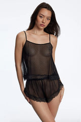 Elevate your lingerie collection with this delicate, sheer cami that effortlessly combines elegance and allure. Crafted from ultra-lightweight mesh fabric, it features a charming dotted texture that adds a subtle yet captivating visual detail. The soft, breathable material gently drapes over the body, offering a barely-there feel that enhances comfort without compromising on style.