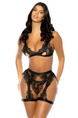 Seductive eyelash lace mimics snake print with this gorgeous lingerie set. Flirtatious cut-outs and a harness garter belt make Janet irresistible.