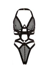 Seduction starts the moment you slip into this bold and bondage-inspired playsuit. Designed with daring fishnet panels and strategically placed elastic straps, it leaves just enough to the imagination while commanding full attention. Underwire cups provide shape and lift, while the open, strappy design tempts from every angle. Whether you're exploring your dominant or submissive side, this piece is all about power, play, and pleasure.