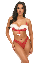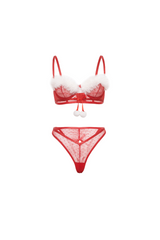 Indulge in the allure of the April Lingerie Set, a captivating two-piece designed to brighten your holiday moments. This elegant ensemble showcases a red underwire bra adorned with plush faux fur trim and a charming pom-pom tie, combining festive cheer with refined sensuality. The coordinating red mesh thong features a playful pom-pom at the back, accented by crisscross straps and delicate dotted mesh that offers a subtle glimpse of skin. Perfect for a romantic surprise or celebrating holiday enchantment, this sophisticated bra and panty set with faux fur accents is ideal for memorable festive evenings. Complete the look with thigh-high stockings and heels for an irresistible finish.