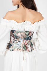 Inspired by the painting of Sandro Botticelli, this gorgeous underbust corset portrays the goddess of love and beauty arriving on Earth. A true masterpiece, made to create the perfect hourglass silhouette.