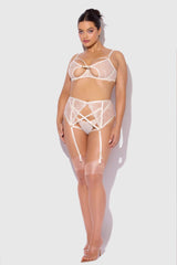 This exquisite lingerie set, thoughtfully tailored for fuller figures, is adorned with intricate floral embroidery and sensual strap detailing. The underwired bra offers sculpted support and a gentle lift, while the matching garter belt, finished with delicate criss-cross accents, frames the silhouette with timeless allure. A celebration of romance, confidence, and craftsmanship perfect for the most unforgettable moments.