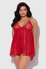 Embrace allure with the Kiki Lace Drop Off Plus Size Babydoll Set, designed to captivate. This striking cherry red sheer lace plus size babydoll features delicate triangle cups, a halter tie neckline accentuating the décolletage, and an open back framed by faux leather trim. The flowing lace drapes elegantly, revealing subtle hints of skin with every movement. Paired with a matching g-string, this set balances provocative style with refined sophistication. Perfect for intimate evenings or moments of self-expression, it invites you to celebrate your bold, confident essence.